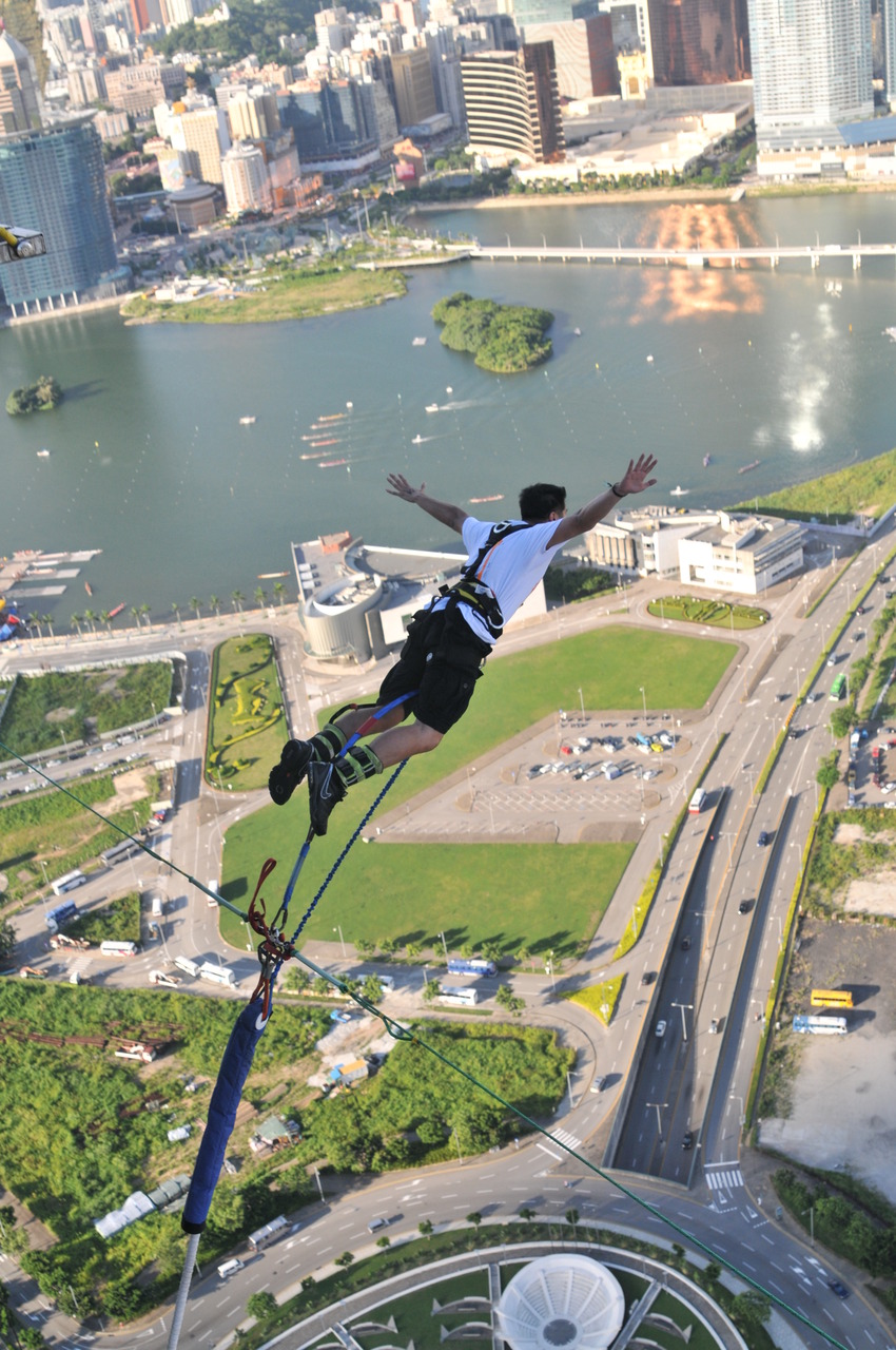 Macau Tower, 233 meters, the highest bungee jump in the world. It was my first time doing a bungee ever. My range of bungee jump research was focused on YouTube videos of bungee coords breaking and also of a man shitting his pants during his plunge.