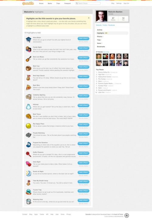 I first heavily started using Gowalla when I was tired of the competition for mayor status and badges on Foursquare. Each of those two mechanics which foursquare revolves around pressured me into checking in and it made me guilty if I didn’t do it. Even while they were completely arbitrary and provided no benefit at all, getting the “Mayor” status of venues, defending that title, and trying to collect the different foursquare badges, was something I found myself thinking about too much. I wanted the social benefit and interactions that came from checkins. I didn’t want to deal with artificial game mechanics, or be in the stuck in a heavily marketed playpen where users participated for the benefit of brands. Gowalla’s approach to location is a lot more fun. They’ve make the “check-in” more social than any of their competition. Highlights Gowalla’s “Highlights” are more like bookmarks or favourites. Despite having a vague name, Highlights are locations that you mark as meaningful in your life, some different spots available to choose from are: – Favourite place to get coffee– Favourite after work pub