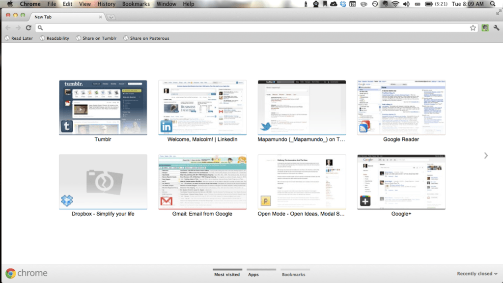 In general I really dislike it when these swipe-able screens transition more than one screen to a single swipe. Using this new Chrome feature, if I’m not careful then with one wipe I can skip over the middle window. I believe the Lion Launchpad screens work the same way.