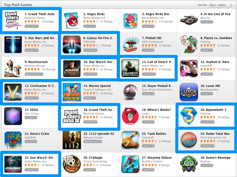 It’s pretty cool how there’s a blend of games that cost upwards of $15 (boxed in blue) with cheaper games mixed throughout in the list of top paid games in the Mac App Store.