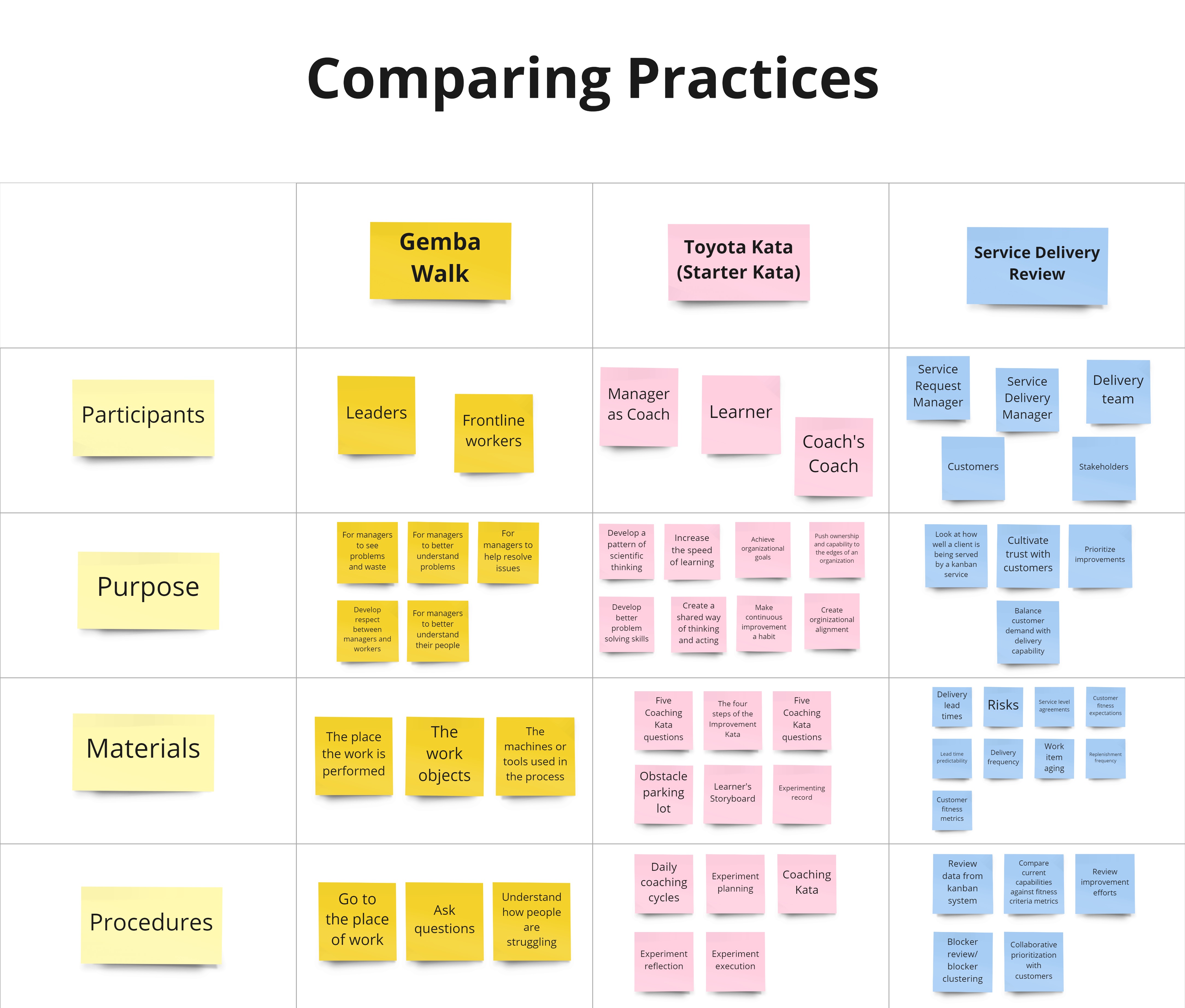 What stood out most to me between these three practices is that the Service Delivery Review is the only one that makes it a point to include customers and stakeholders as part of the process. In the Service Delivery Review, customer collaboration drives service improvements and demand prioritization. The Service Delivery Review is also the only practice that makes creating trust with customers and meeting customer fitness criteria an explicit goal.