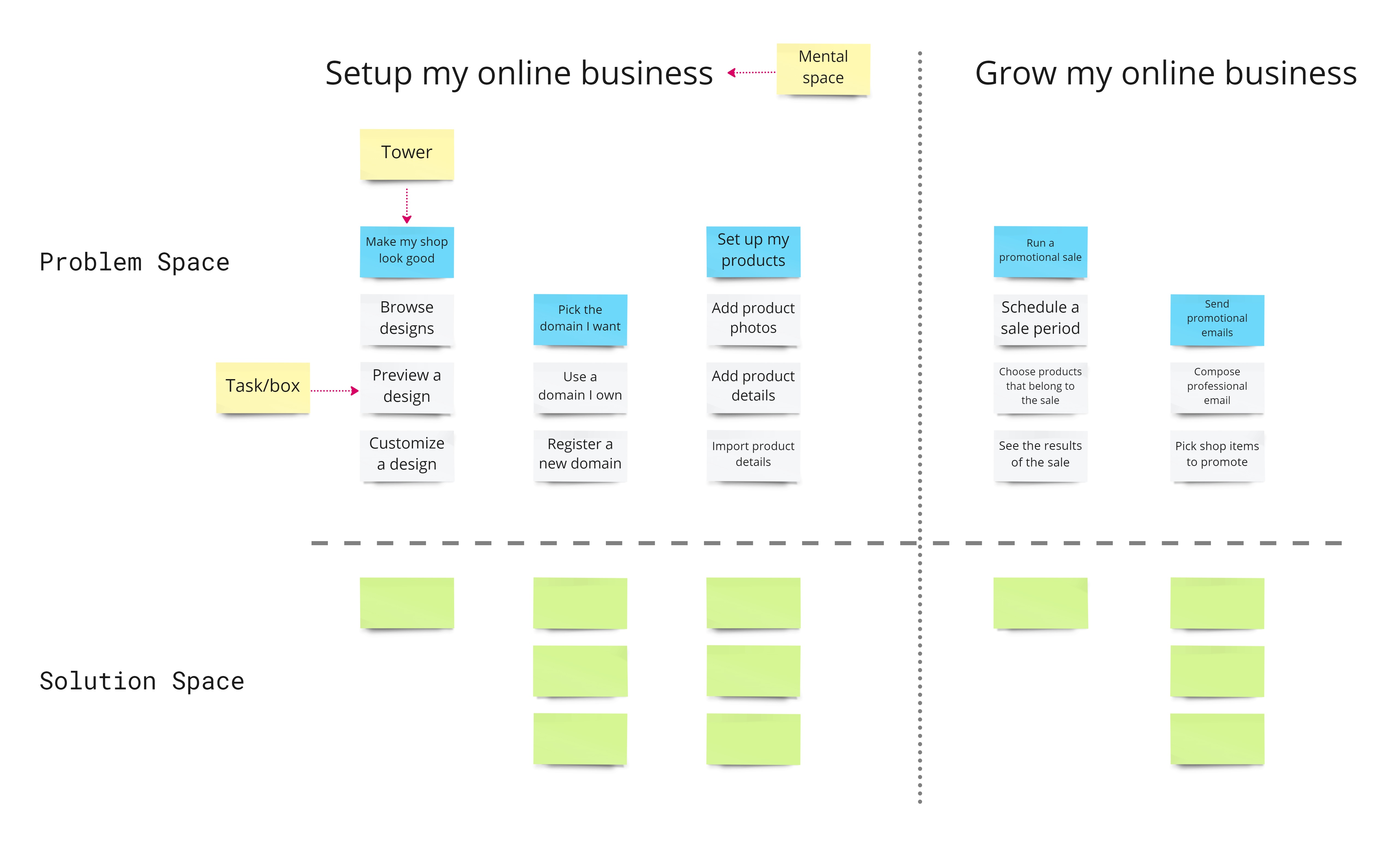I first learned about Mental Model Diagrams form Indy Young’s book, Mental Models. The technique uses data from qualitative research, like customer interviews, and extracts all the goals users are trying to accomplish in a particular situation, scenario or domain. After categorizing these goals and tasks into structures called Towers and Mental Spaces, you draw a line across the diagram. Under that line go all of the solutions, features, or capabilities that might support users in accomplishing those goals.