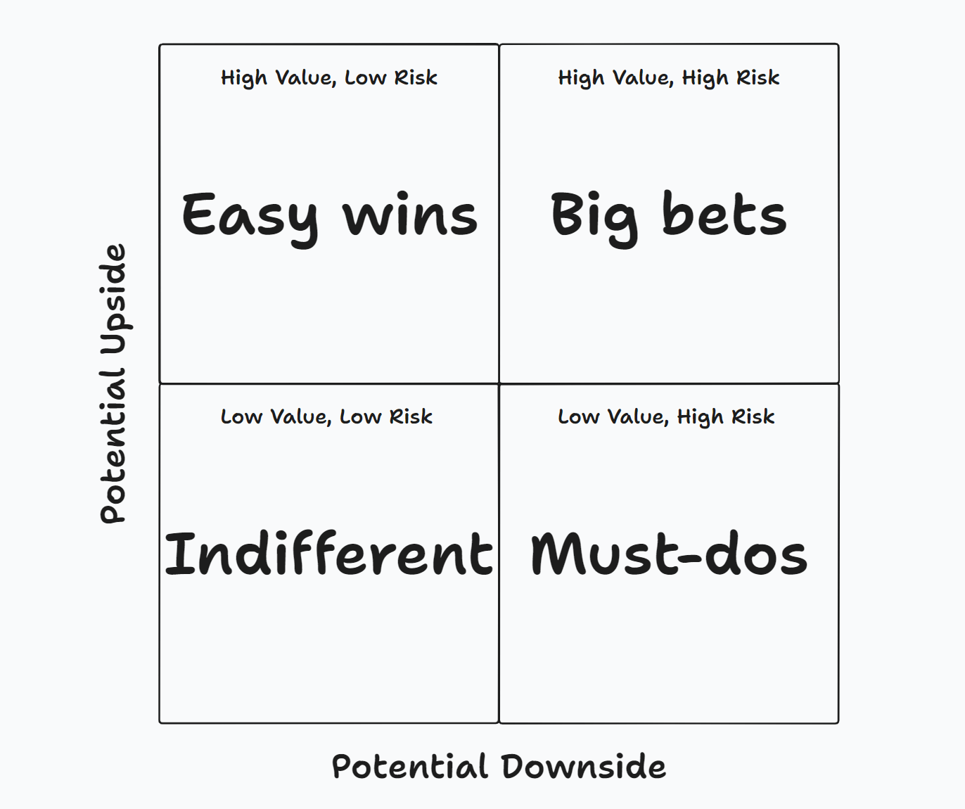 We ended up with a 2×2 matrix with the two dimensions being the risk of doing them wrong and the value of doing them right. Adding this second axis gave us what we needed to organize our options and judge whether the client was focusing on the right options.