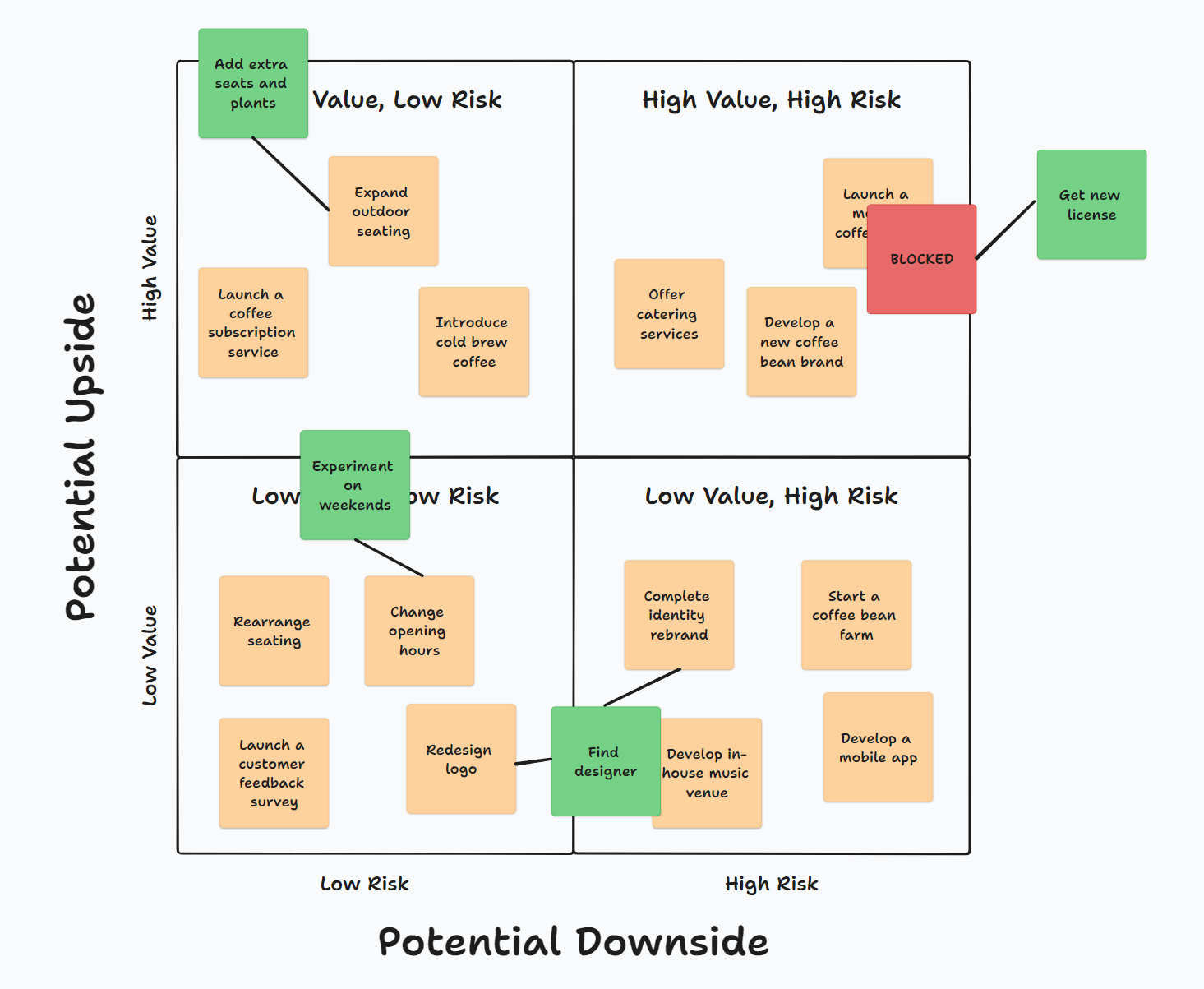 Still, after completing the matrix, there are some additional ideas that could be useful to think about, including: Breaking high-risk items down and finding ways to reduce the risk or lowering the cost of experimenting and making it easy to try different things.