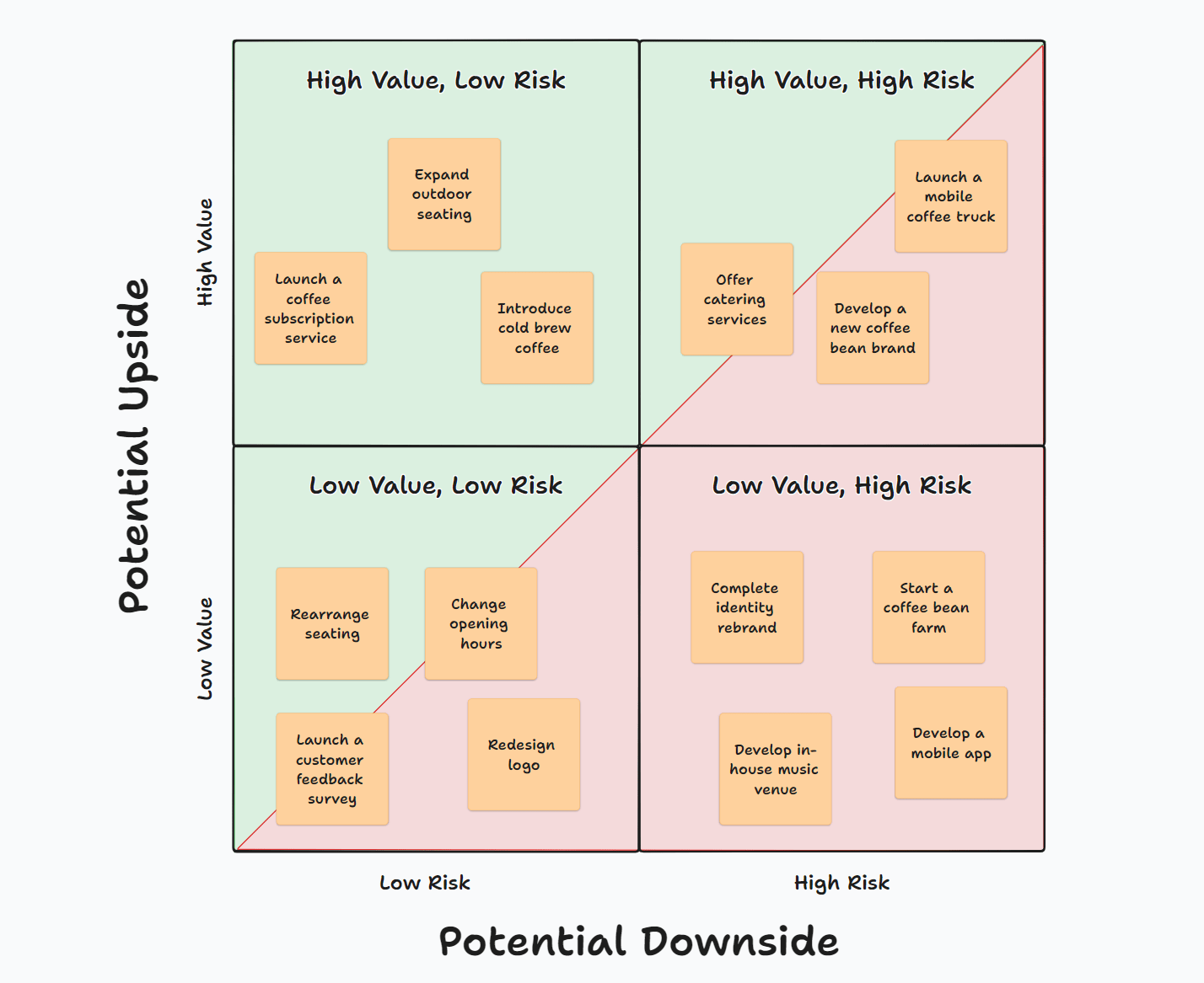 I’ve been cautious in saying “mapping” and not “prioritizing” when talking about this risk-value matrix because when working with this tool, I’m interested in finding a better way of seeing things and understanding the options available, not to make statements to my client about which options are more important or which they should start first.