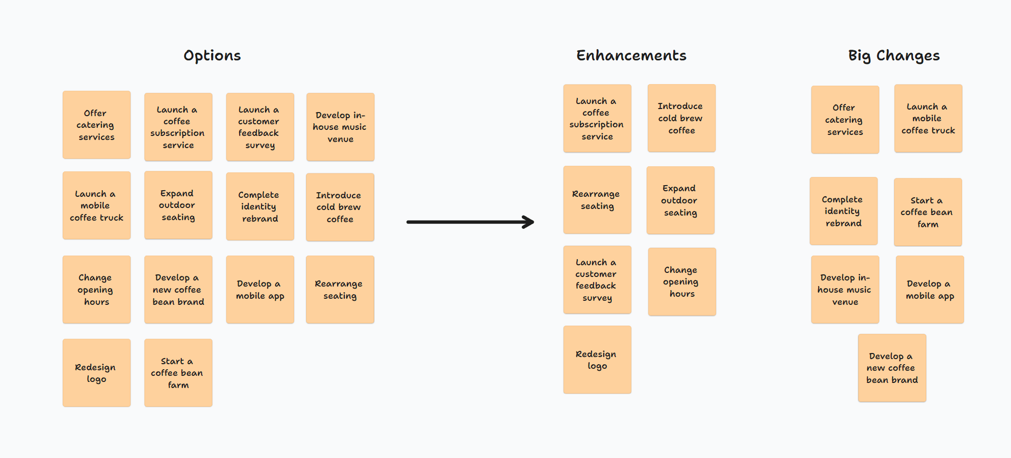 When we started mapping these options, my client was the first to say, “Some of these are big changes, and some are just enhancements. There can be big consequences if you get the big changes wrong.” So, we started by simply splitting the options into two groups, “Enhancements” and “Big Changes.”
