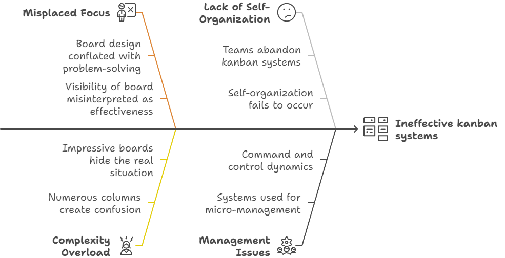 People often fall into the trap of thinking that the most visible part of a kanban system, the board, is the most important. They conflate the activity of board design with problem-solving, which leads teams to create elaborate kanban boards and believe that once they have a board, they’ve also fixed their problems.