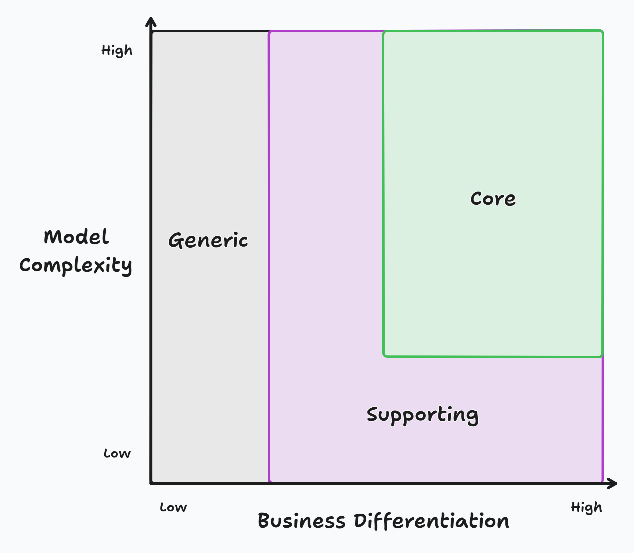 The goal of activities mapped to the generic domain is to get other teams to handle the heavy lifting or acquire pre-existing solutions for our team to leverage. That way, our team can focus on their core domain.