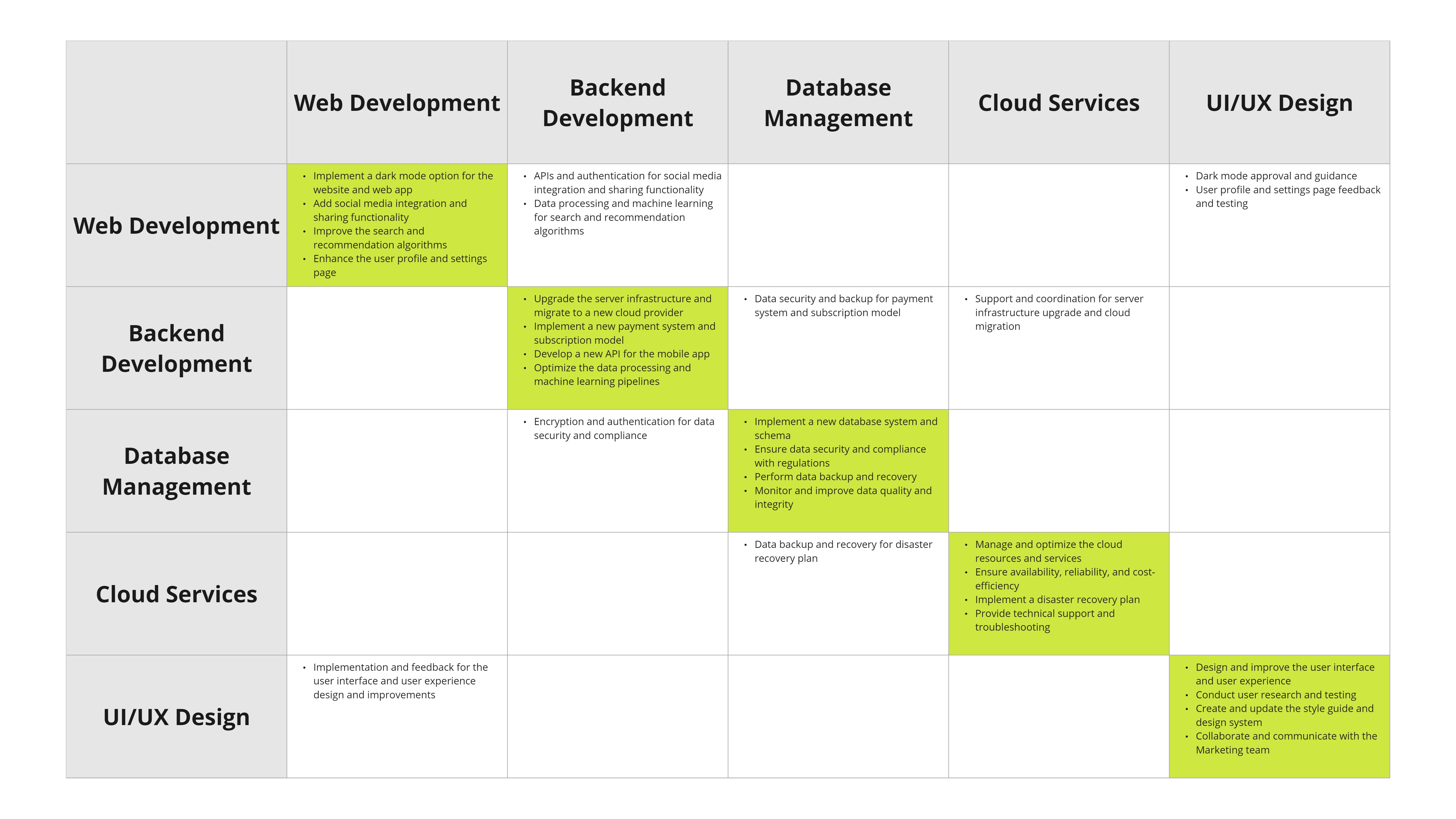 - Add the scope a team plans to deliver at each cell where the team intersects with itself.
