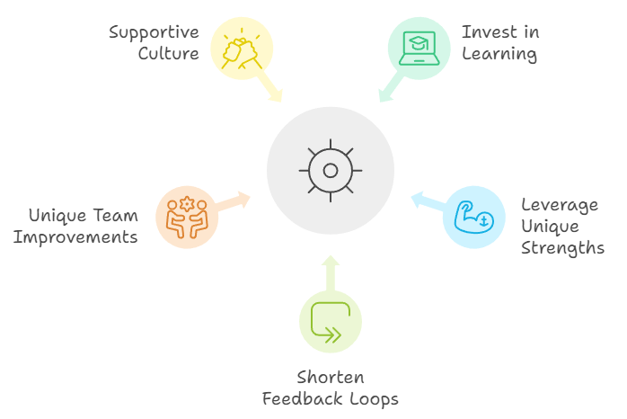 - Invest in learning: Invest in education and create opportunities for your team to gain experience and develop expertise. Invest in things like workshops, coaching, pairing and mentorship. Learn from others through lectures or case studies. Establish learning goals for people on your team.