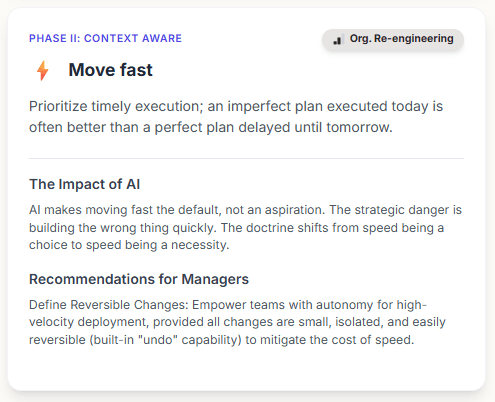The Impact of AI: AI makes moving fast the default, not an aspiration. The strategic danger is building the wrong thing quickly. The doctrine shifts from speed being a choice to speed being a necessity.