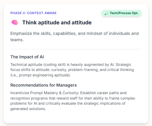 Recommendations for Managers: Technical aptitude (coding skill) is heavily augmented by AI. Strategic focus shifts to attitude: curiosity, problem framing, and critical thinking (i.e., context engineering aptitude).