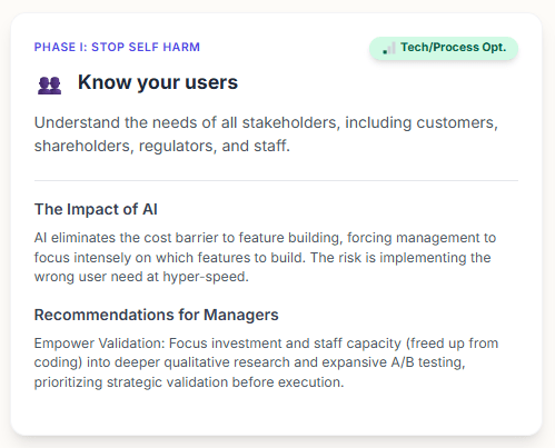 Recommendations for Managers: Empower Validation – Focus investment and staff capacity (freed up from coding) into deeper qualitative research and expansive A/B testing, prioritizing strategic validation before execution.
